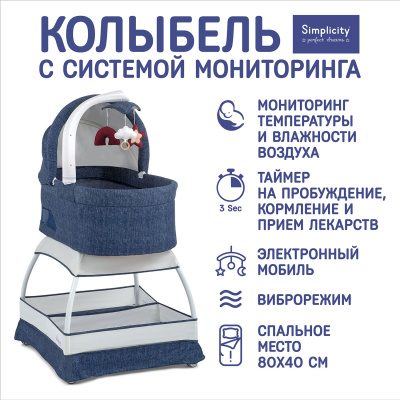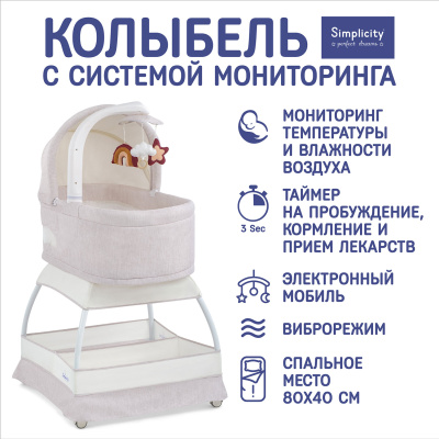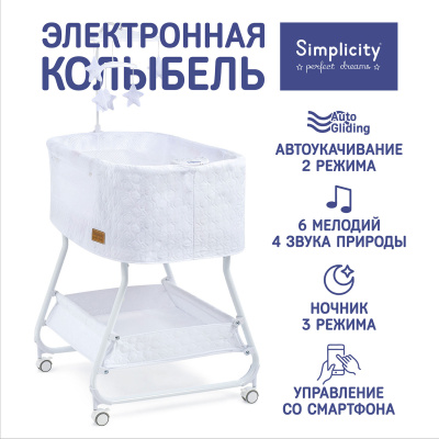 Simplicity производит люльки-качалки более 70 лет. Наш опыт воплотился в многообразии колыбелей, имеющих все необходимое для комфорта малыша, и не обремененных лишними деталями. Сегодня Симплисити — это музыкальная люлька с вибрацией и ночником, очень удобная в использовании, поскольку:• Может использоваться в качестве приставной кроватки/