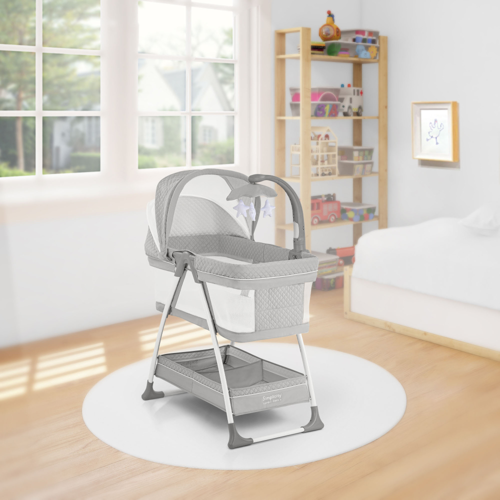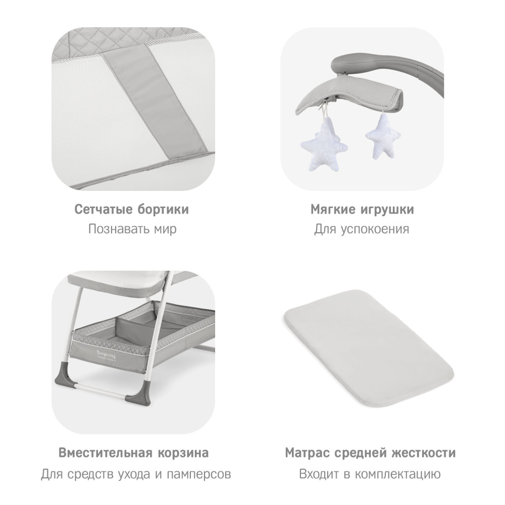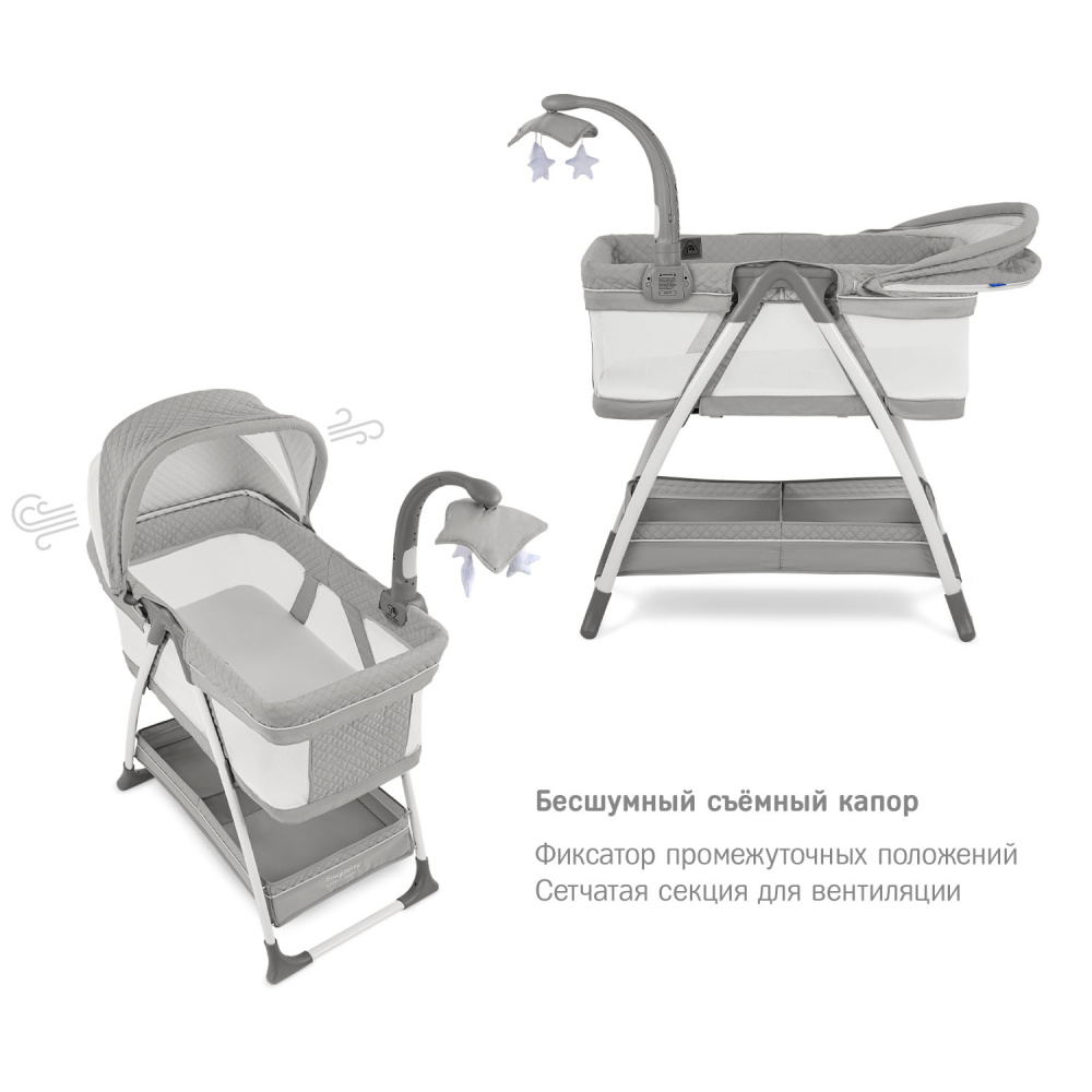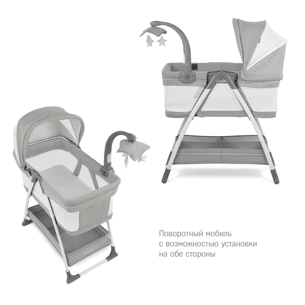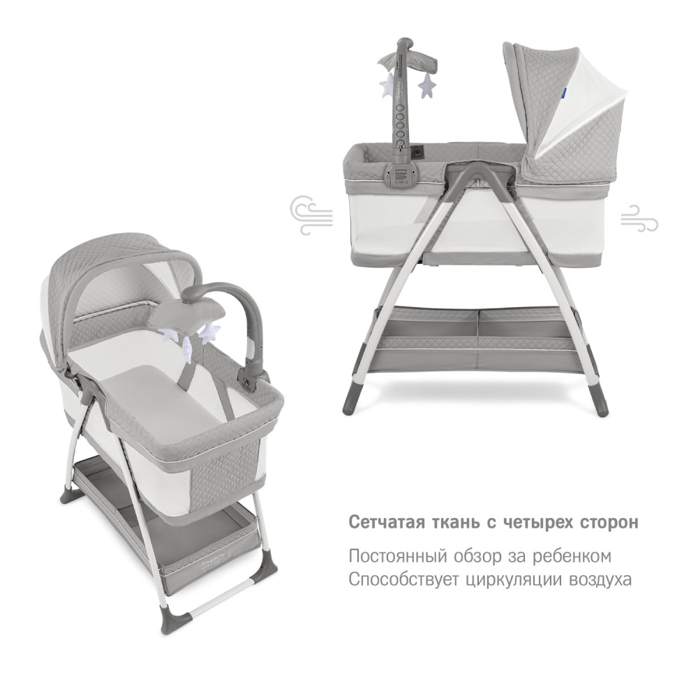 - Комплектация: колыбель, съёмный матрасик, наматрасник, капор, мобиль с игрушками, тканевая корзина для белья