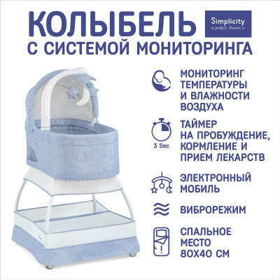 Simplicity производит люльки-качалки более 70 лет. Наш опыт воплотился в многообразии колыбелей, имеющих все необходимое для комфорта малыша, и не обремененных лишними деталями. Сегодня Симплисити — это музыкальная люлька с вибрацией и ночником, очень удобная в использовании, поскольку:• Может использоваться в качестве приставной кроватки/