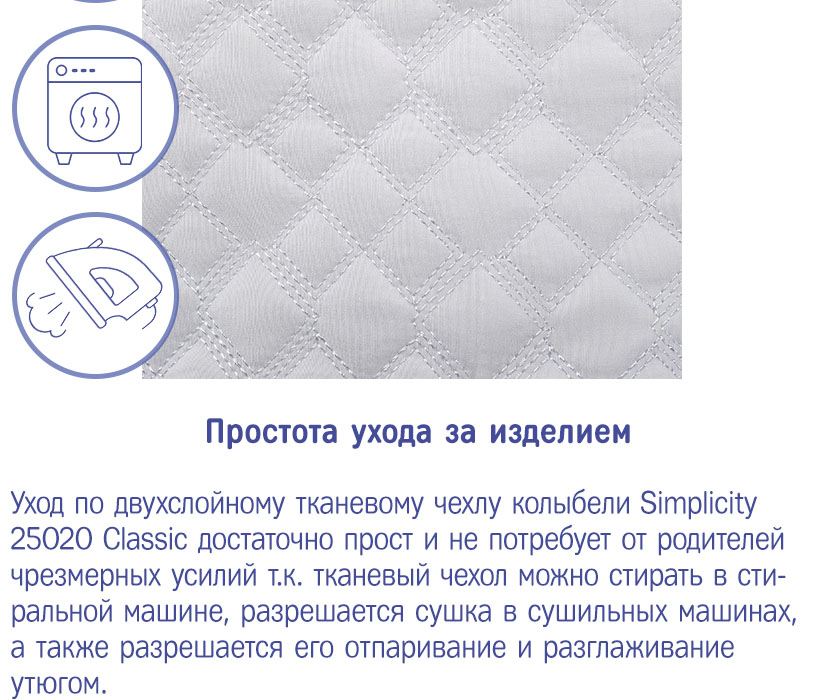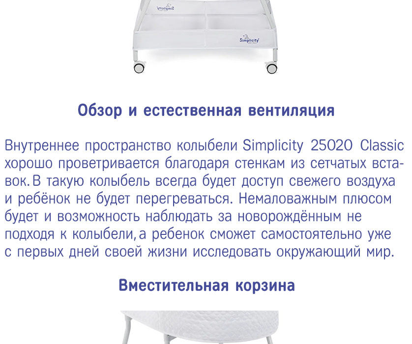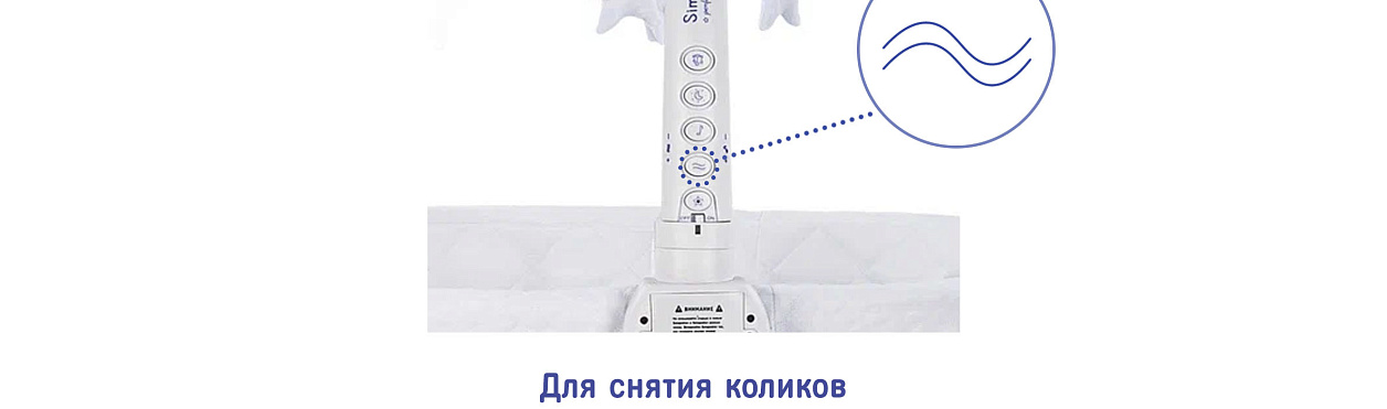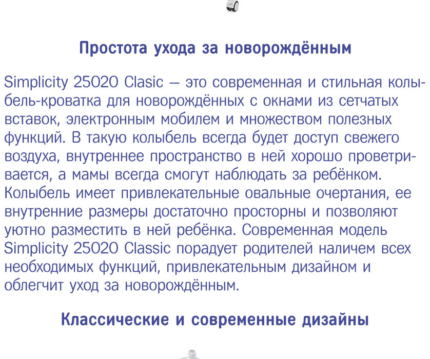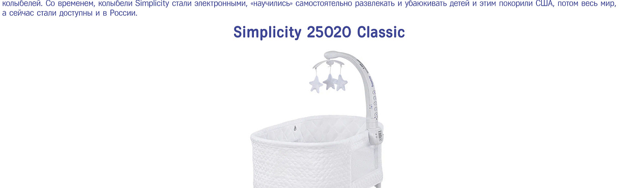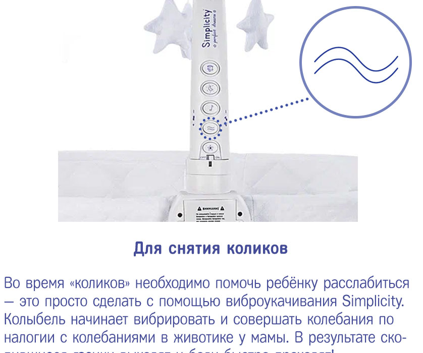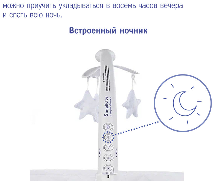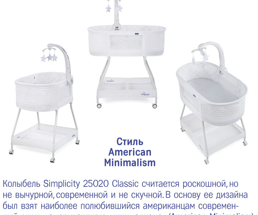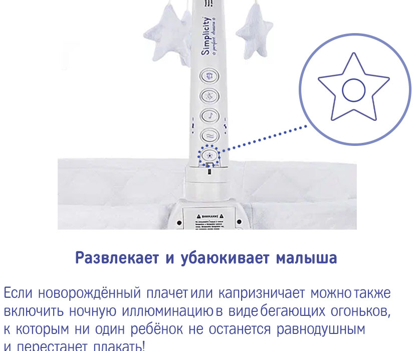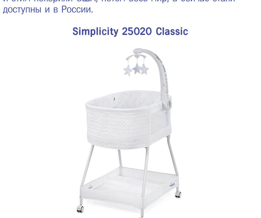 Среди преимуществ Simplicity 25020 Classic выделяется электронный мобиль с подвесными игрушками, совмещенный с блоком управления колыбелью. Мобиль работает от батареек и выполняет одновременно несколько функций: вращает карусель с подвесными мягкими игрушками, осуществляет музыкальное сопровождение с синхронно мерцающими огоньками, которые помогут успокоить или развлечь малыша, включает вибрацию и ночную подсветку. Вибромасс -