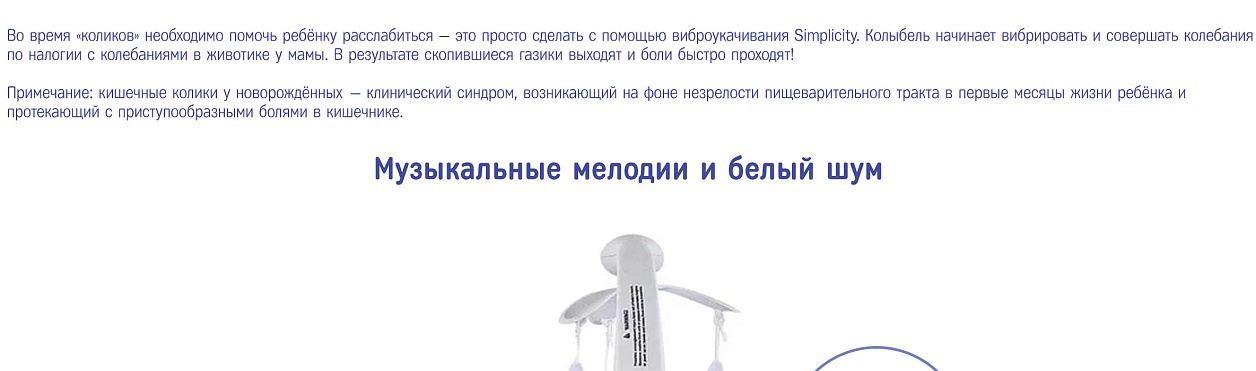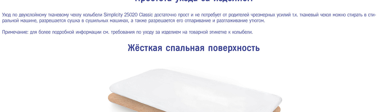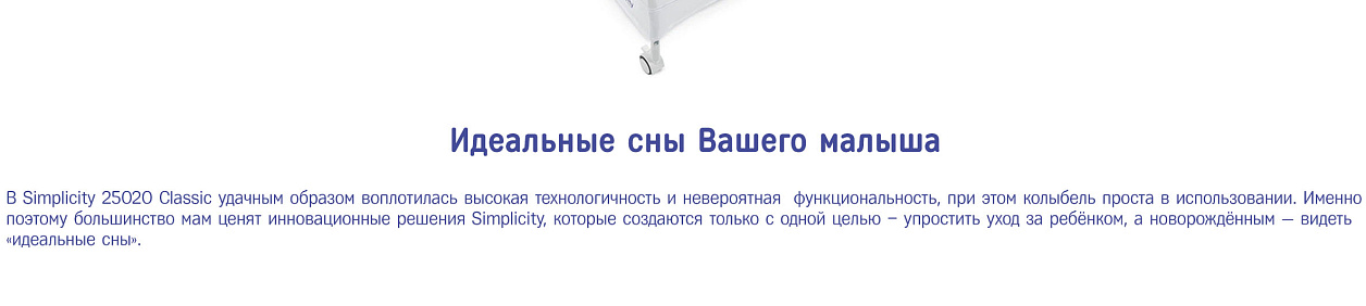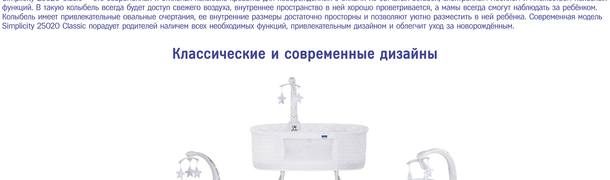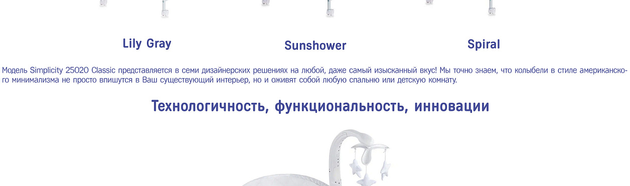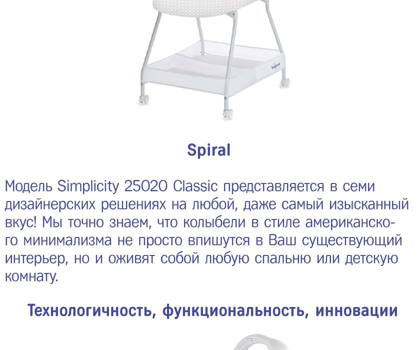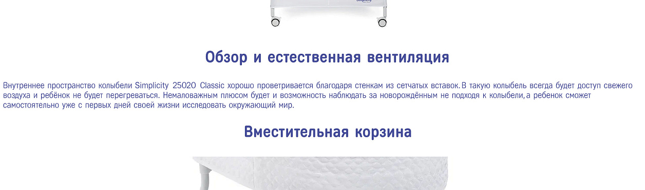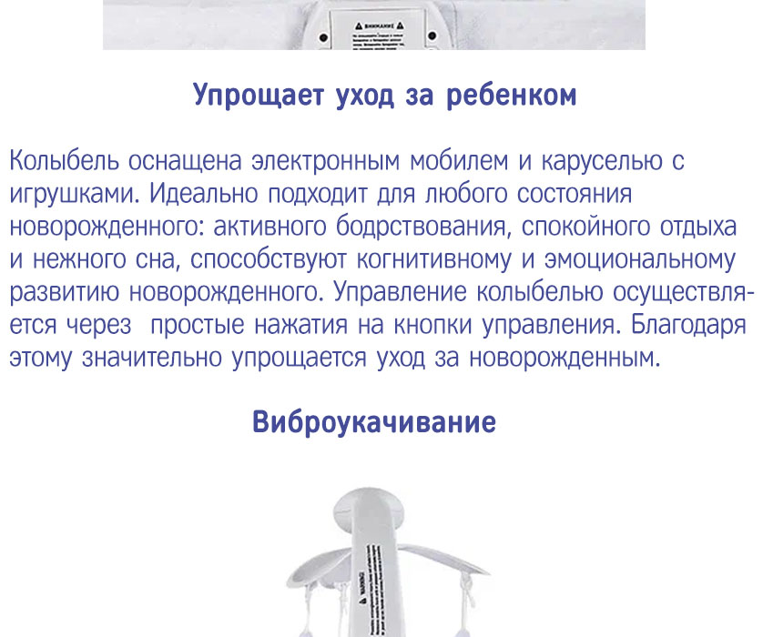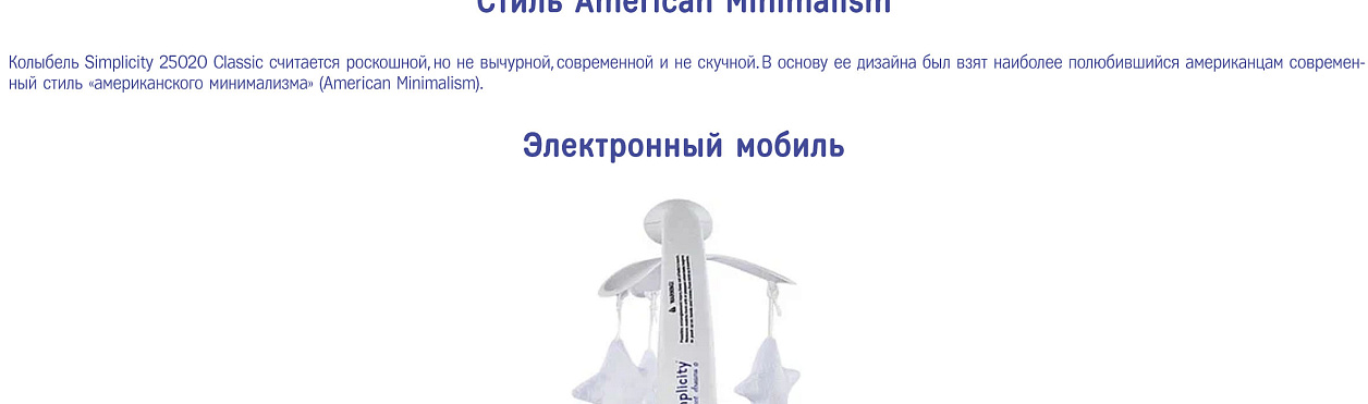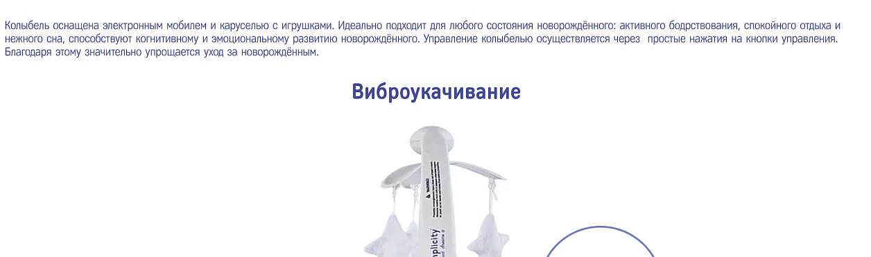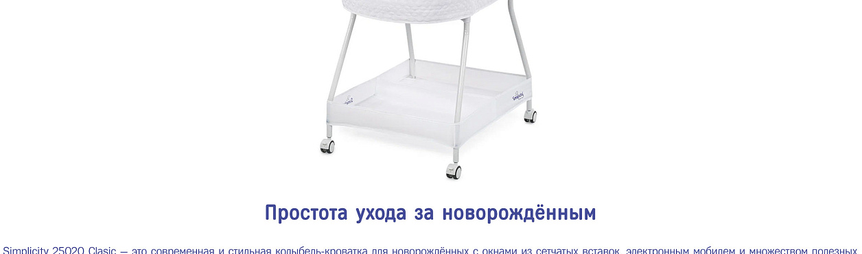 Среди преимуществ Simplicity 25020 Classic выделяется электронный мобиль с подвесными игрушками, совмещенный с блоком управления колыбелью. Мобиль работает от батареек и выполняет одновременно несколько функций: вращает карусель с подвесными мягкими игрушками, осуществляет музыкальное сопровождение с синхронно мерцающими огоньками, которые помогут успокоить или развлечь малыша, включает вибрацию и ночную подсветку. Вибромасс -