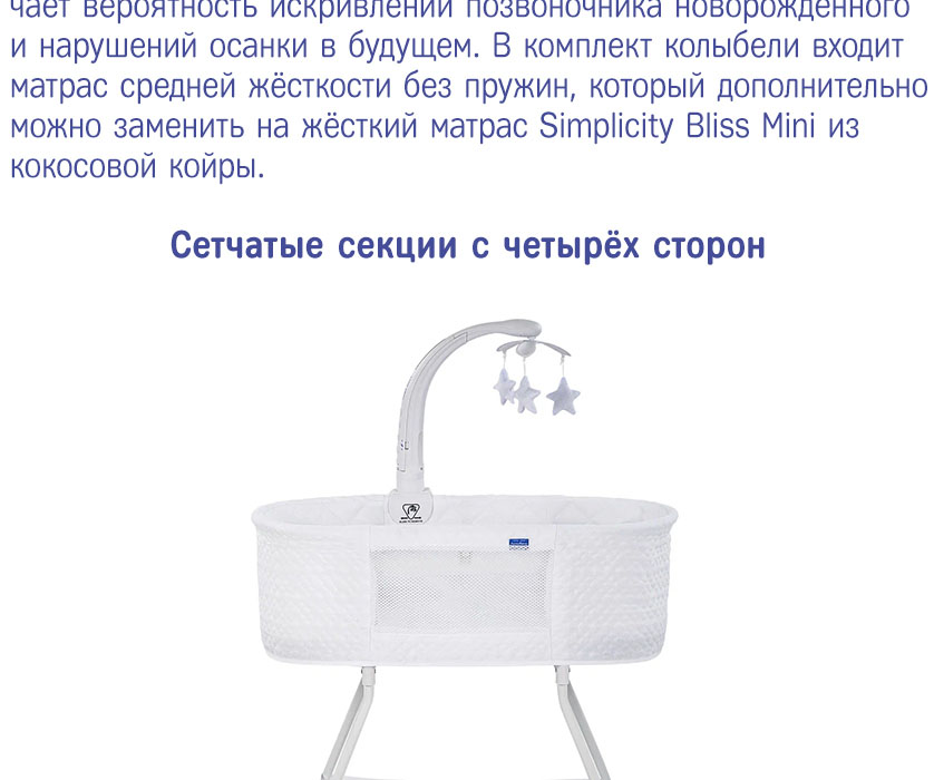 Описание товараSimplicity 25020 Classic – современная и стильная колыбель-кроватка для новорожденных с окнами из сетчатой вставки, электронным мобилем и множеством полезных функций. В такую колыбель всегда будет доступ чистого воздуха, внутреннее пространство в ней хорошо проветривается, а мамы всегда смогут наблюдать за ребенком. Уютная люлька имеет привлекательные овальные очертания, ее внутренние размеры достаточно просторны и позволяют уютно разместить в ней ребенка. Чехол сделан из плотной ткани, внутри находится упругий матрасик, к которому прилагается простынка на резинке.