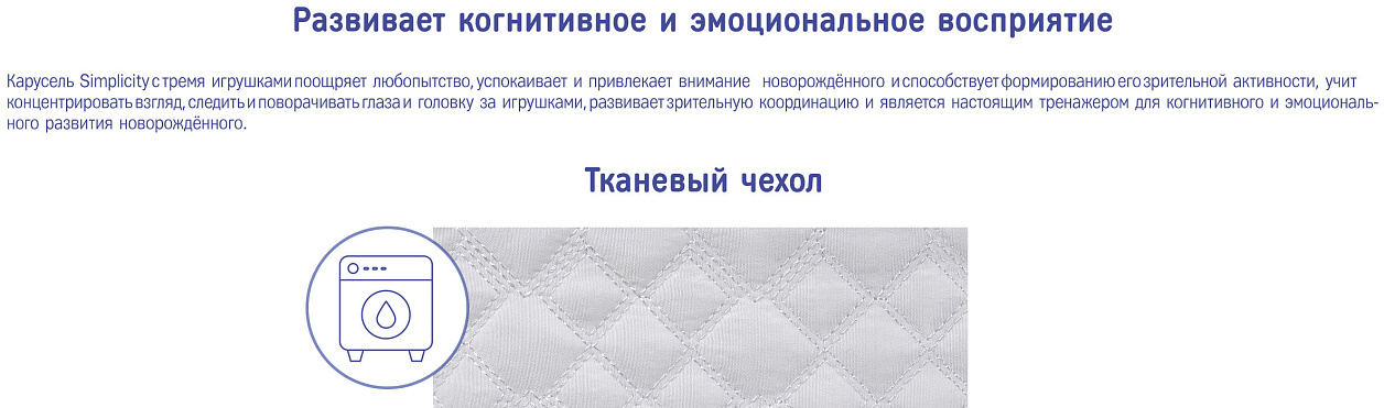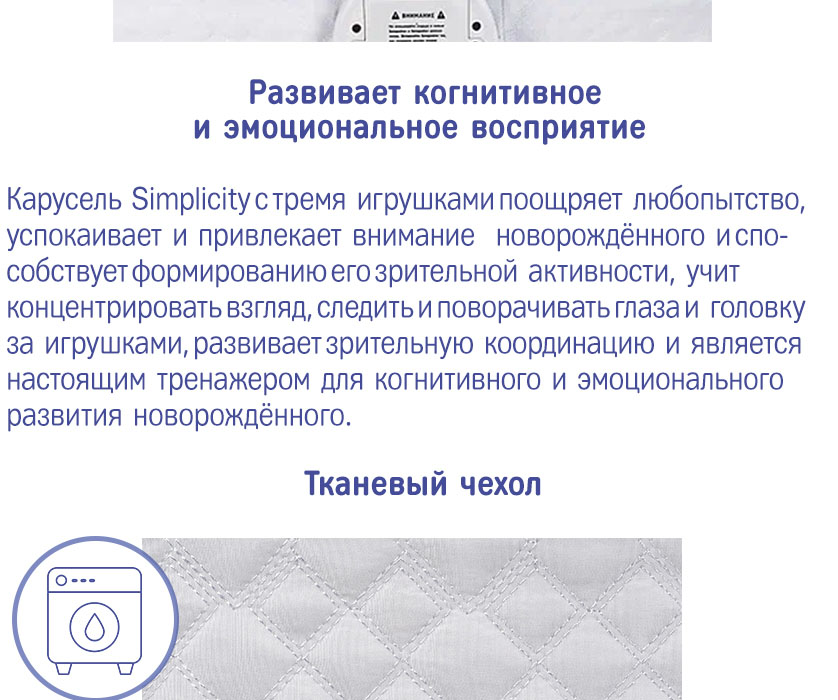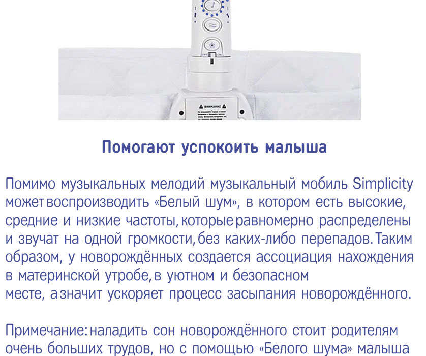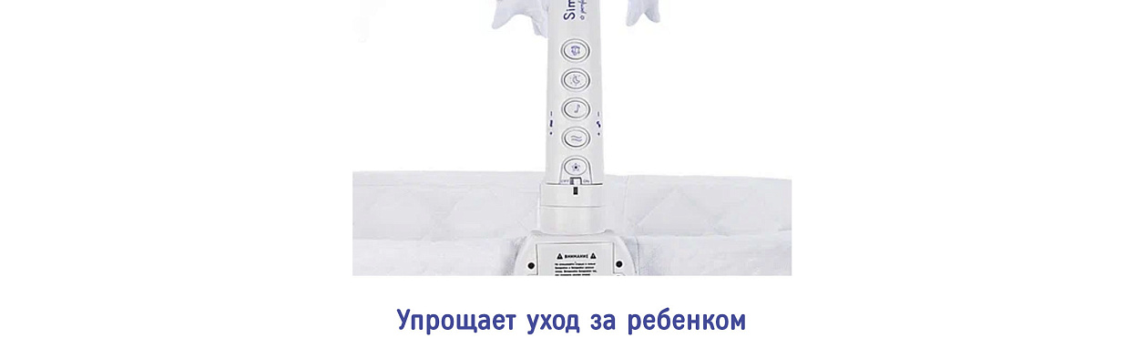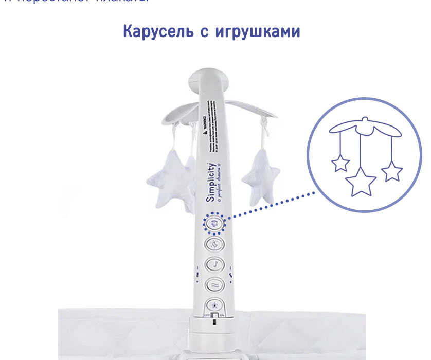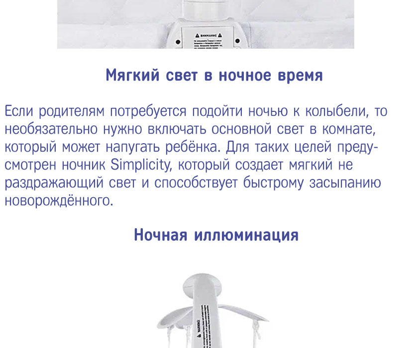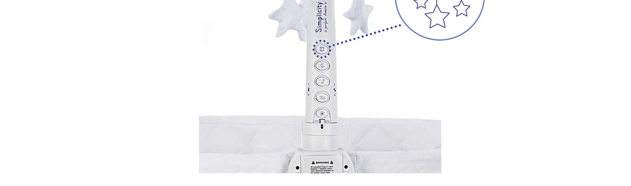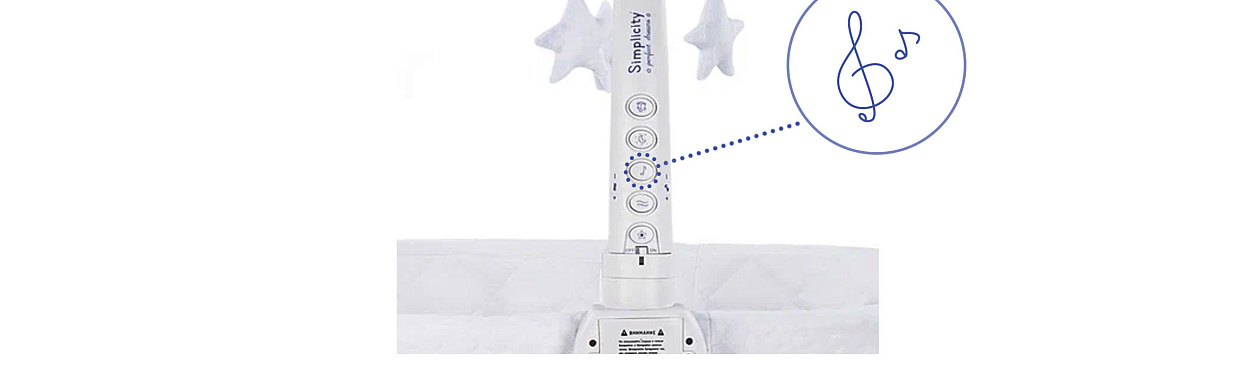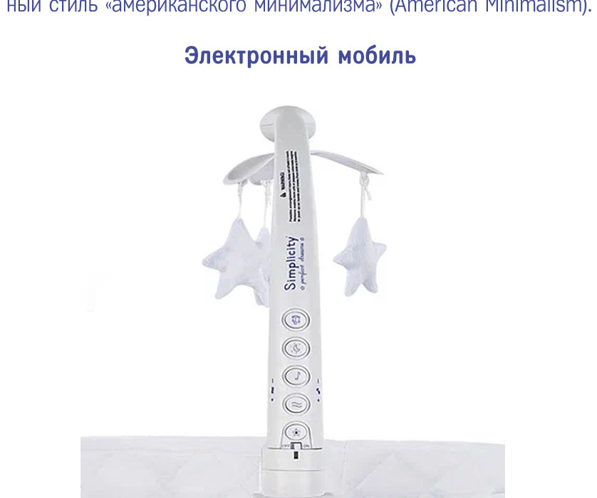 Среди преимуществ Simplicity 25020 Classic выделяется электронный мобиль с подвесными игрушками, совмещенный с блоком управления колыбелью. Мобиль работает от батареек и выполняет одновременно несколько функций: вращает карусель с подвесными мягкими игрушками, осуществляет музыкальное сопровождение с синхронно мерцающими огоньками, которые помогут успокоить или развлечь малыша, включает вибрацию и ночную подсветку. Вибромасс