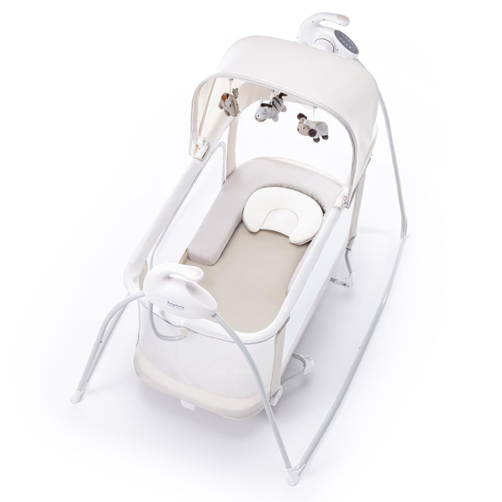 Особенностью данной модели является многофункциональная панель управления, которая обеспечивает автоматическое укачивание с возможностью изменения скорости качания. В ней есть и дополнительные полезные опции как проигрывание мелодии пения птиц и шума воды, а также возможность воспроизведения собственных мелодий с USB-накопителя или сотового телефона. Очень удобен и датчик, реагирующий на плач ребенка, который автоматически запускает укачивание и воспроизведение музыки. Управление колыбелью осуществляется вручную, пультом дистанционного управления, а также возможно и голосовое управление колыбелью.