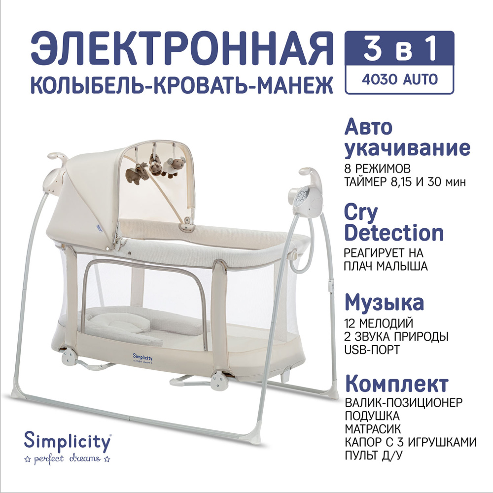 Simplicity 4030 Auto - это многофункциональная колыбель для новорожденных с автоматическим маятником поперечного качания, которая по мере взросления ребенка может использоваться и как детский манеж.